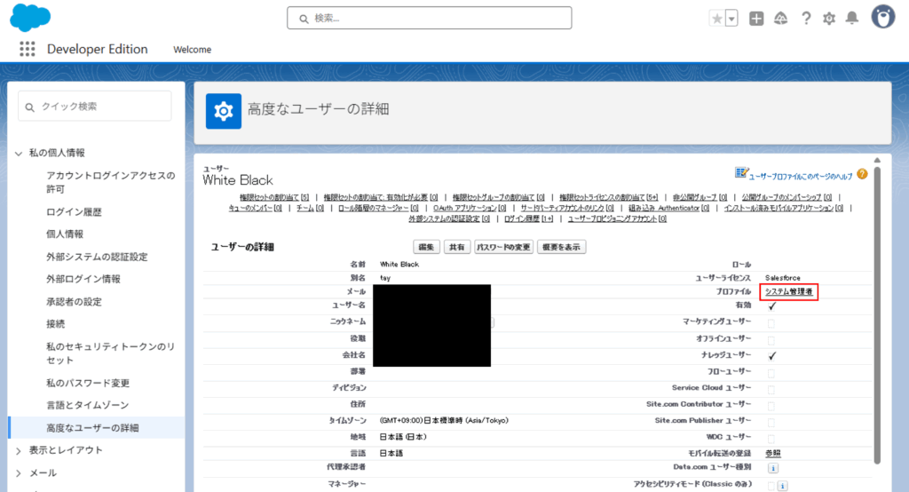 押下後、[ユーザーの詳細]画面よりユーザーに設定されているプロファイルを押下しアクセスします。
